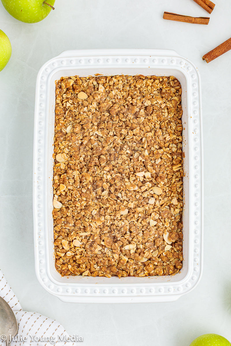 This is a fresh take on apple crisp; one that leans into the pure flavor of the fruit rather than heaping on the spice.