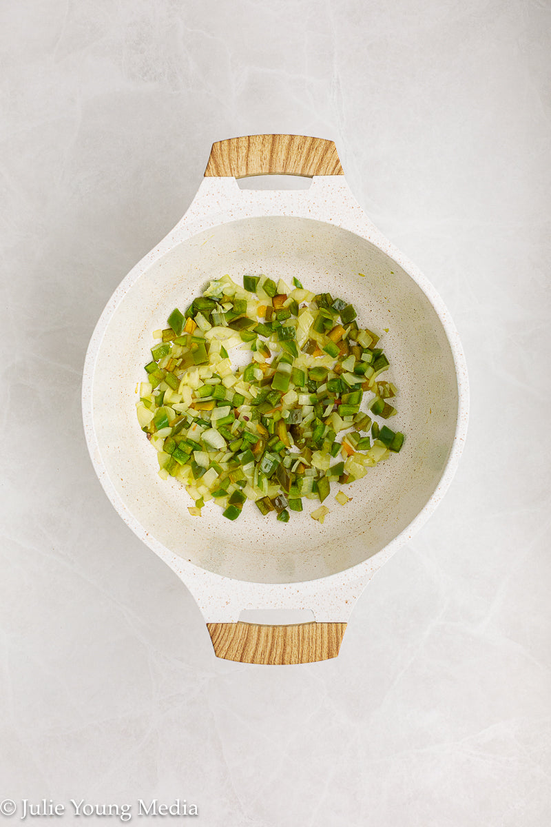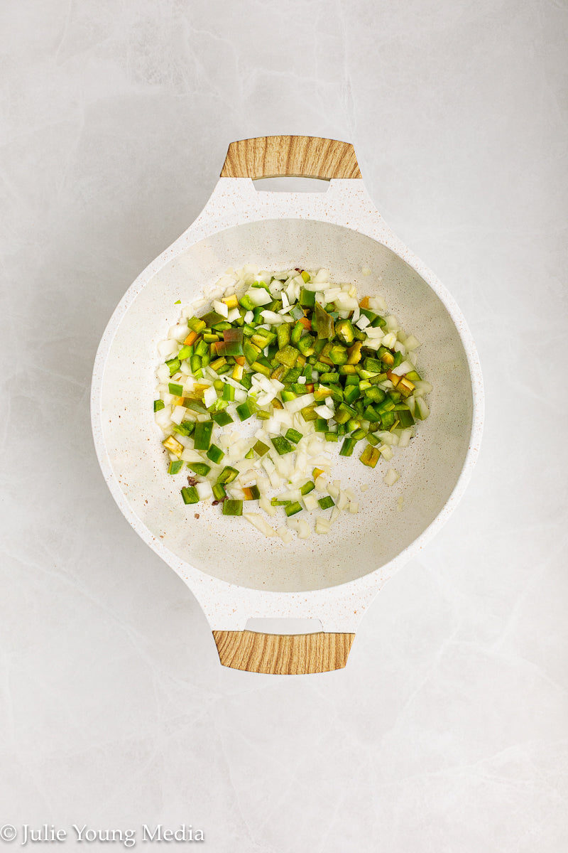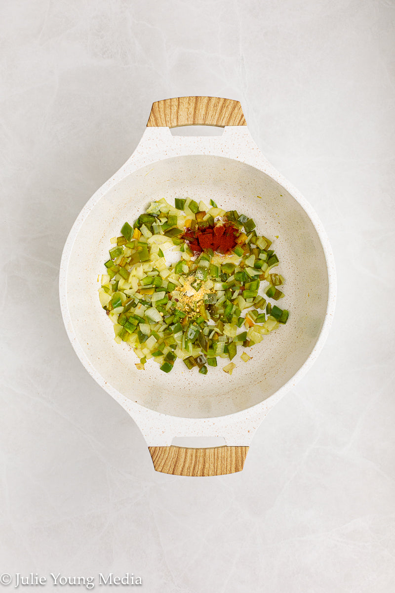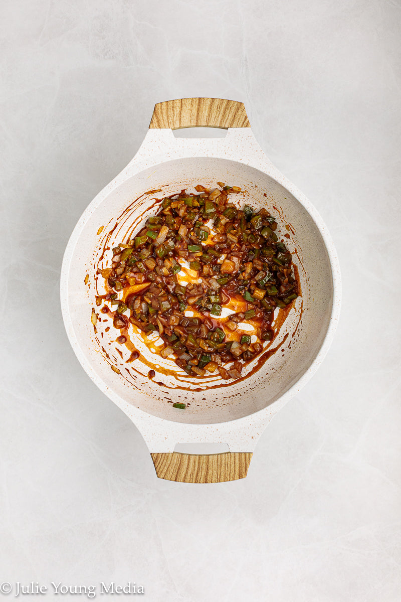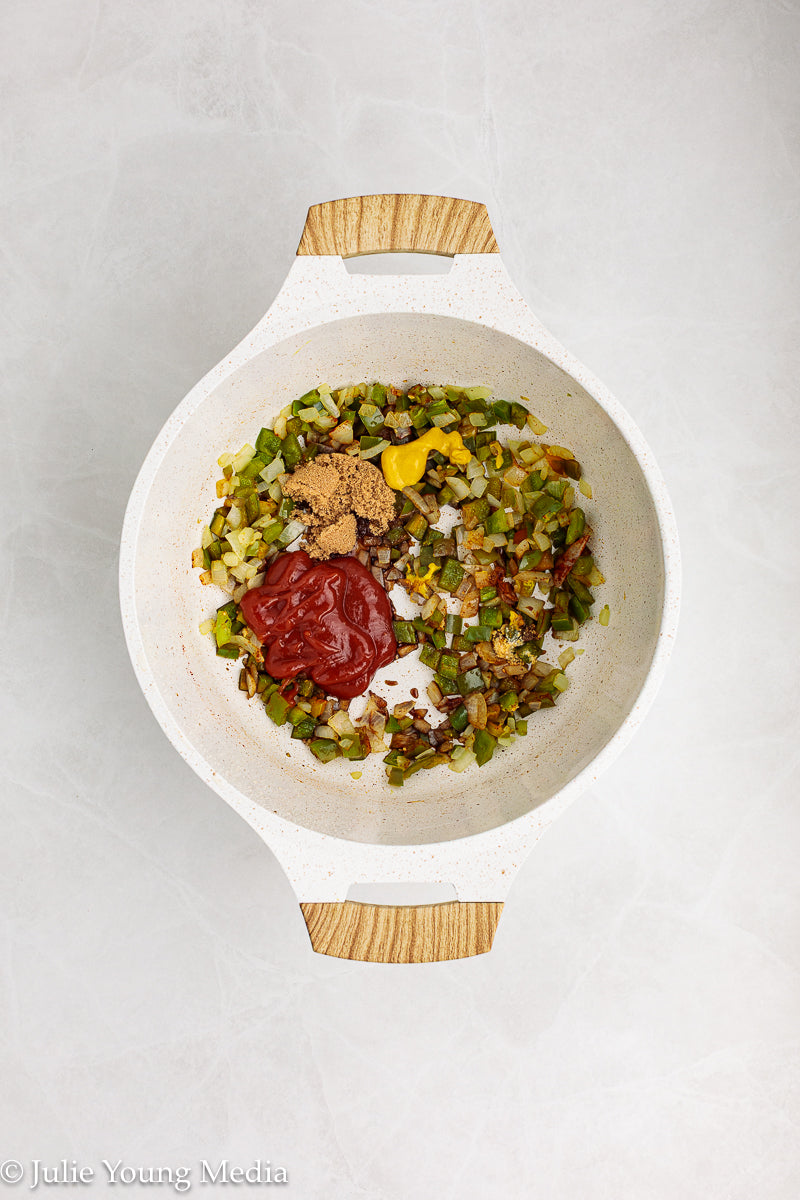 Ingredients: Ground beef, canned baked beans, onion, green pepper, ketchup, brown sugar, yellow mustard, Worcestershire sauce, garlic powder, smoked paprika, apple cider vinegar, and liquid smoke (optional).