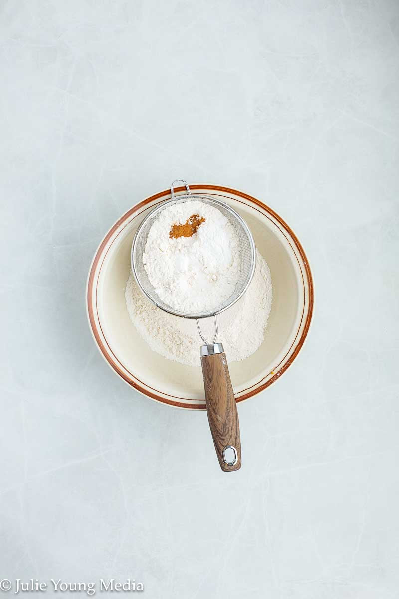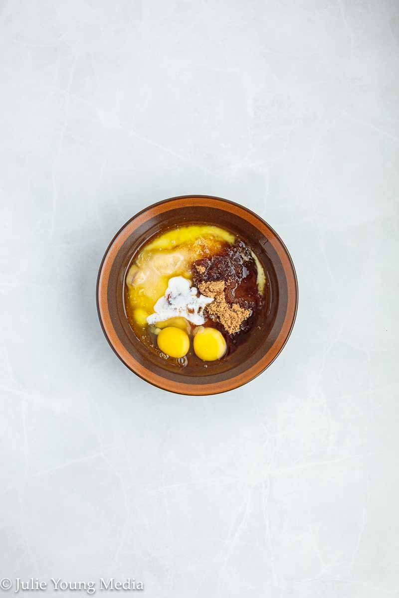 Ingredients: All-purpose flour, Baking soda, baking powder, salt, cinnamon, banana, brown sugar, eggs, chocolate chunks, butter, vegetable oil, buttermilk, vanilla.