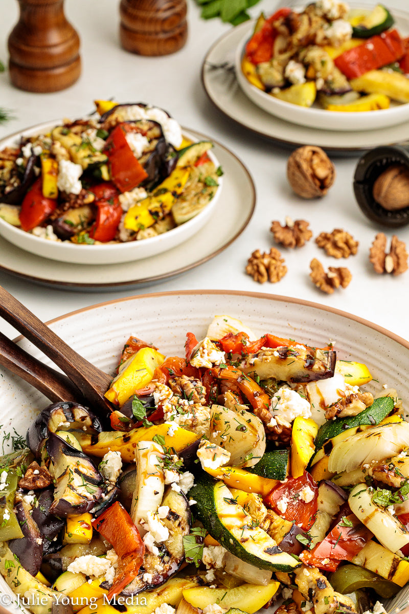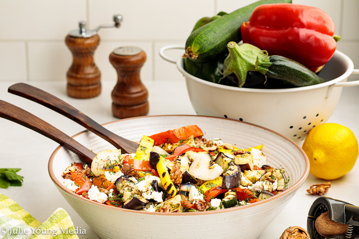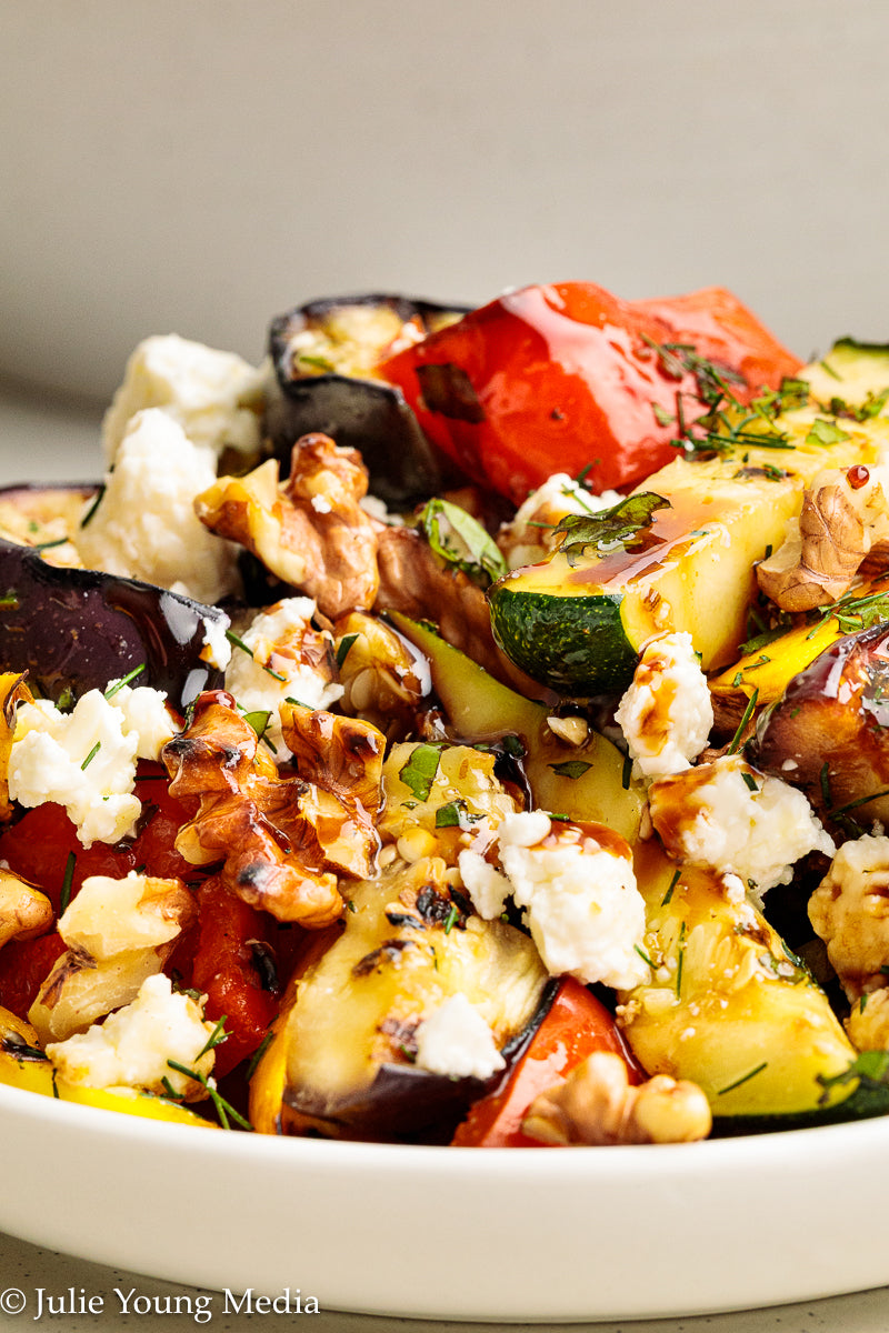 This vibrant grilled vegetable side dish celebrates smoky char, fresh herbs, and bright Mediterranean flavors. Eggplant, peppers, zucchini, and sweet onion are dry-grilled until deeply caramelized, then dressed while still warm with lemon, garlic, and cumin. A finishing layer of salty feta, toasted walnuts, and a drizzle of pomegranate molasses brings richness, contrast, and just enough sweet-tart depth to take the dish over the top.