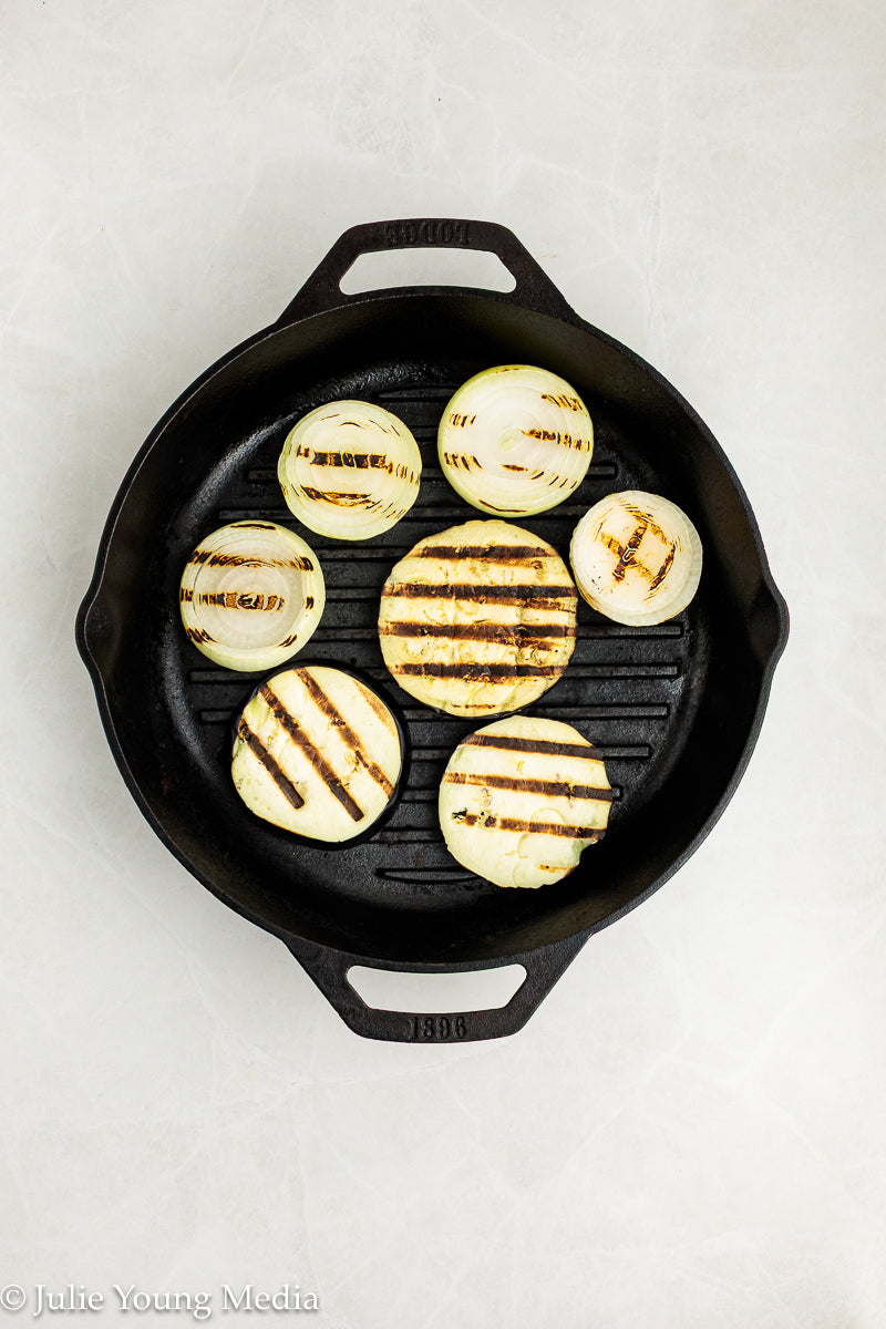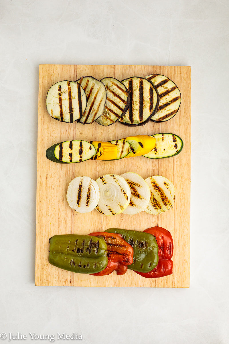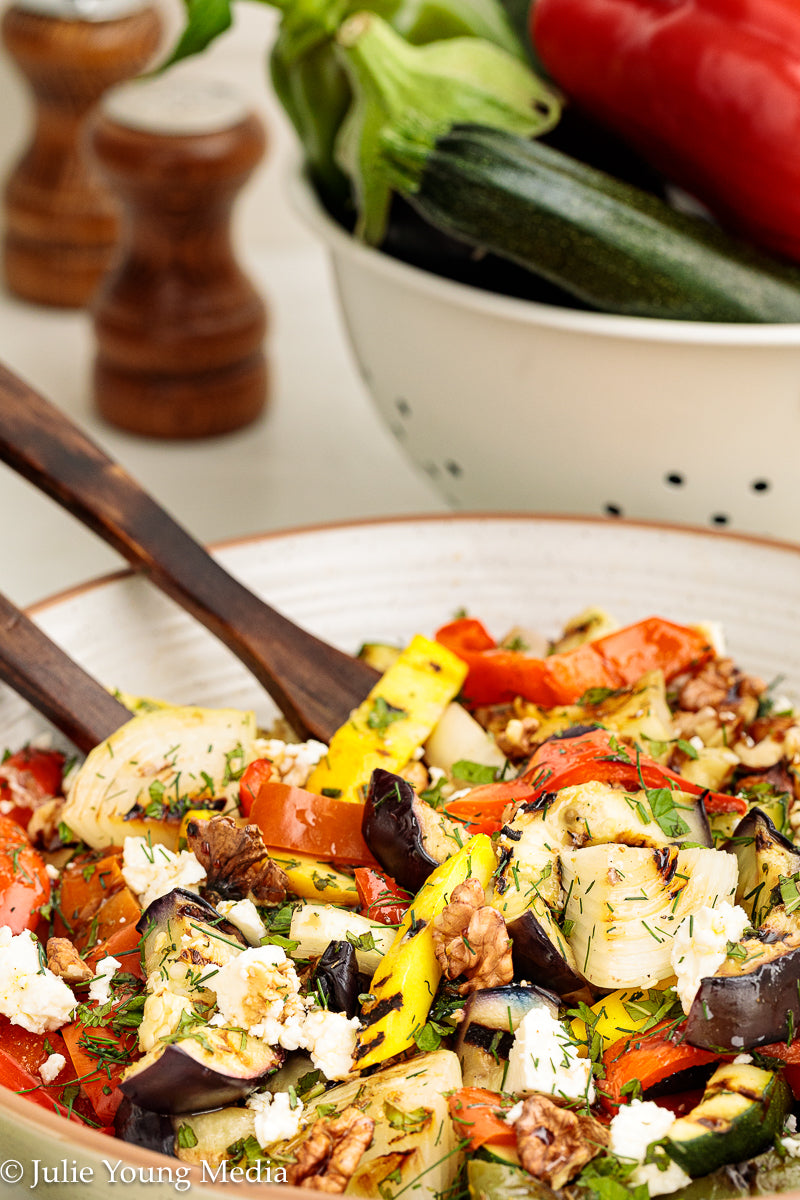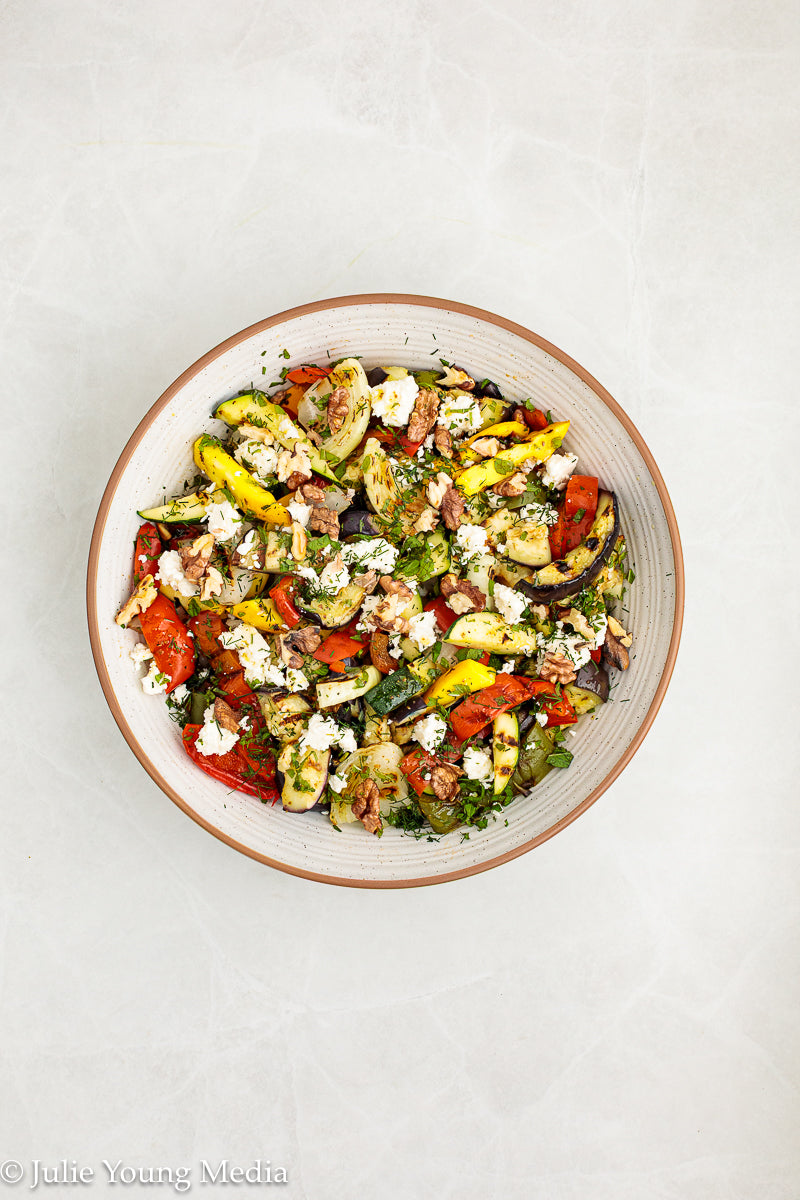 This vibrant grilled vegetable side dish celebrates smoky char, fresh herbs, and bright Mediterranean flavors. Eggplant, peppers, zucchini, and sweet onion are dry-grilled until deeply caramelized, then dressed while still warm with lemon, garlic, and cumin. A finishing layer of salty feta, toasted walnuts, and a drizzle of pomegranate molasses brings richness, contrast, and just enough sweet-tart depth to take the dish over the top.