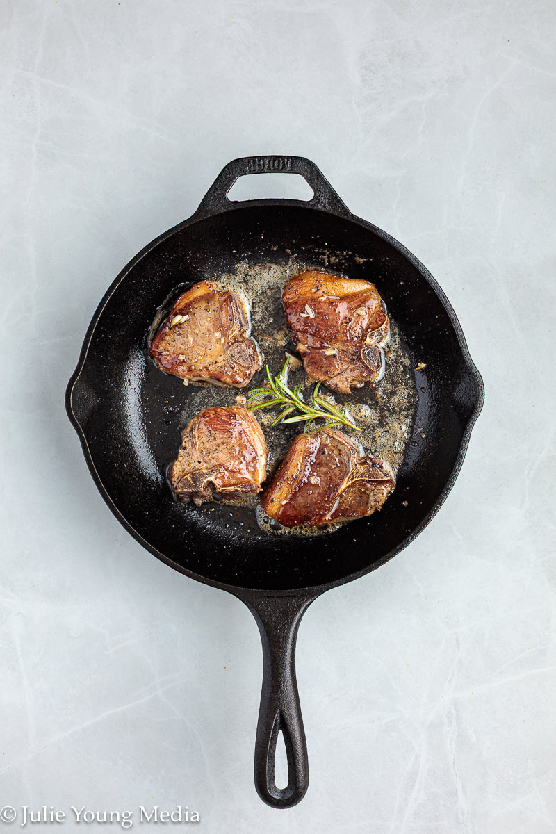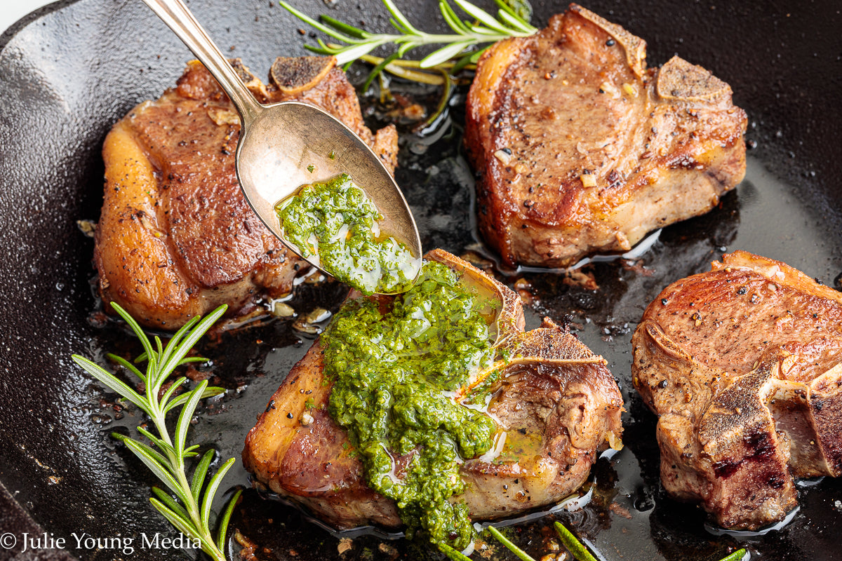 Tender lamb loin chops are quickly seared until beautifully caramelized, then finished with a vibrant rosemary chimichurri. Rosemary is balanced with garlic, parsley, mint, and a restrained splash of acid to create a deeply flavorful sauce that complements the lamb without overpowering it. Easily scalable, this dish is ideal for a celebratory family meal that doesn't require hours in the kitchen.
