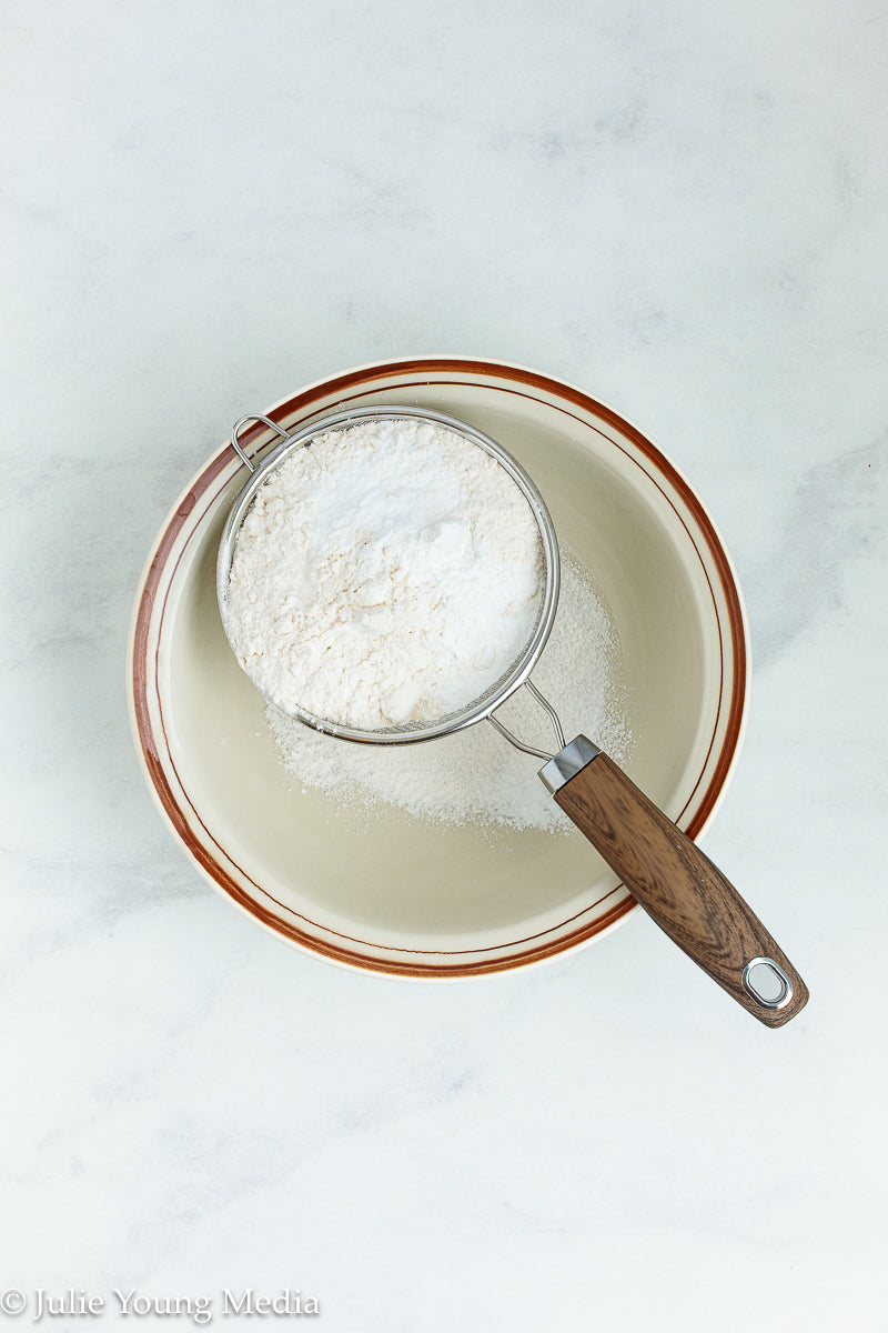 Ingredients: Whole milk ricotta, eggs, butter, olive oil, all-purpose flour, sugar, baking powder, baking soda, vanilla, salt, lemon zest, lemon juice. Optional garnish: powdered sugar, lemon slices, fresh berries.