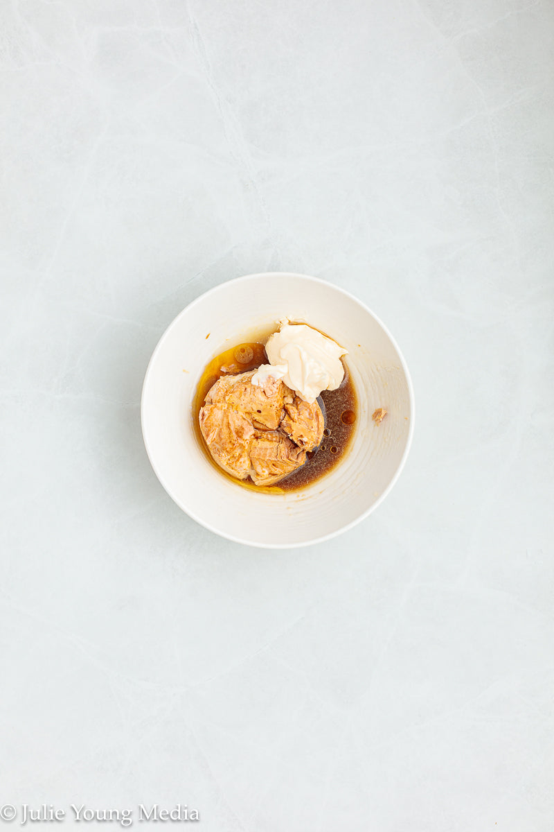 Key Ingredients: Canned tuna; cooked rice; mayonnaise; sesame oil; soy sauce; rice vinegar. Optional toppings: sesame seeds; green onions, sriracha, nori, edamame, radishes, cucumber.