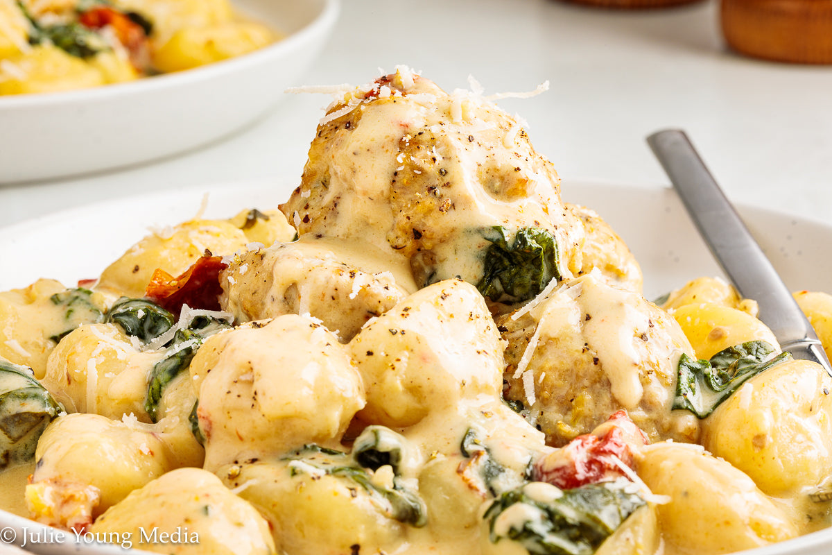 These tender baked chicken meatballs finish cooking in a creamy, garlic-scented sauce alongside pillowy gnocchi, baby spinach, and a small hit of sun-dried tomatoes for depth. Browning the meatballs in the oven first keeps them light and well-shaped, while the slow cooker does the gentle work of bringing everything together.